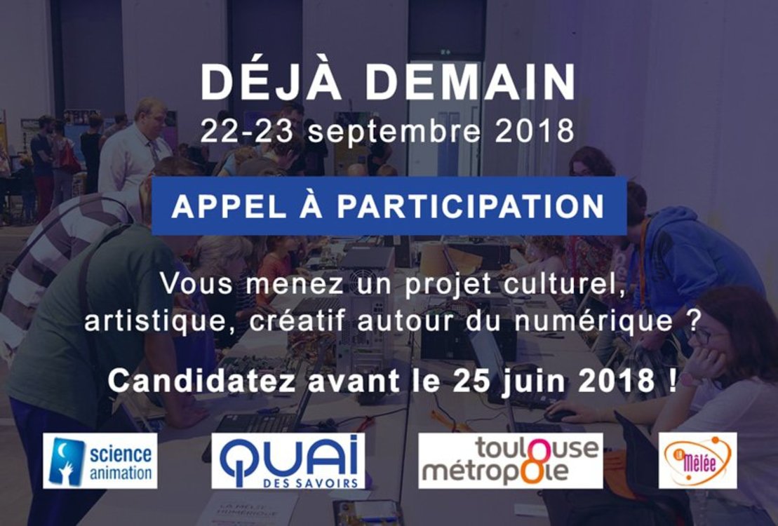 Dans le cadre de la prochaine édition qui aura lieu du 24 au 28 septembre 2018 au Quai des Savoirs à Toulouse, le Quai des Savoirs et la Mêlée souhaitent proposer un week-end tout public dédié à la culture numérique et à l'innovation les 22 et 23 septembre 2018 : Déjà demain.