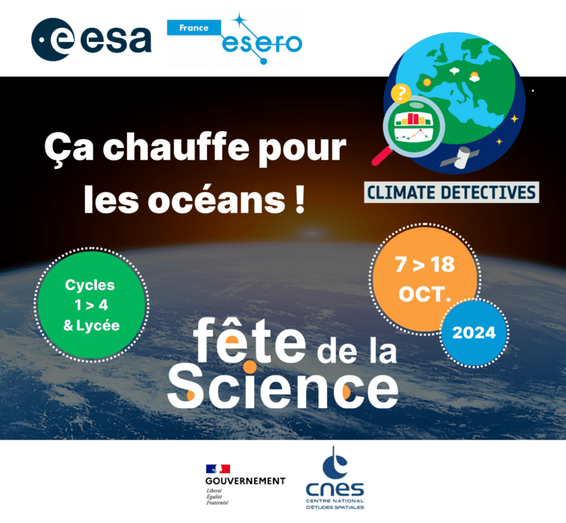 A l'occasion de la Fête de la science 2024, l’équipe ESERO France, dans le cadre du projet éducatif européen Climate Detectives de l'ESA et coordonné en France par le CNES, a lancé un défi pour les jeunes et leurs responsables éducatifs (en classe, en milieu péri et extrascolaire ou à la maison). Ce challenge se déroulera du 7 au 18 octobre et aura pour objectif de réaliser trois activités du projet Climate Detectives liées à la thématique des océans.