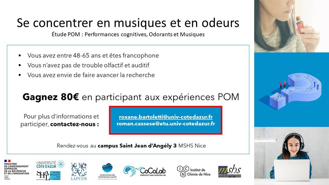 L'étude POM a besoin de vous ! Aidez la recherche en psychologie cognitive en participant à l'étude POM : l'environnement musical et olfactif permet-il d'aider à la concentration ? Nous recherchons des personnes francophones et ayant entre 48 et 65 ans pour participer à notre étude. Contactez-nous à l'adresse mail roxane.bartoletti@univ-cotedazur.fr pour avoir toutes informations supplémentaires.