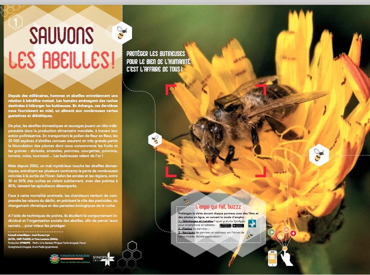 L’exposition multimédia « Sauvons les abeilles » permet au visiteur de découvrir le monde étonnant des abeilles, domestiques et sauvages, pollinisatrices de l’essentiel des plantes que nous consommons (fruits, légumes, céréales, café…).