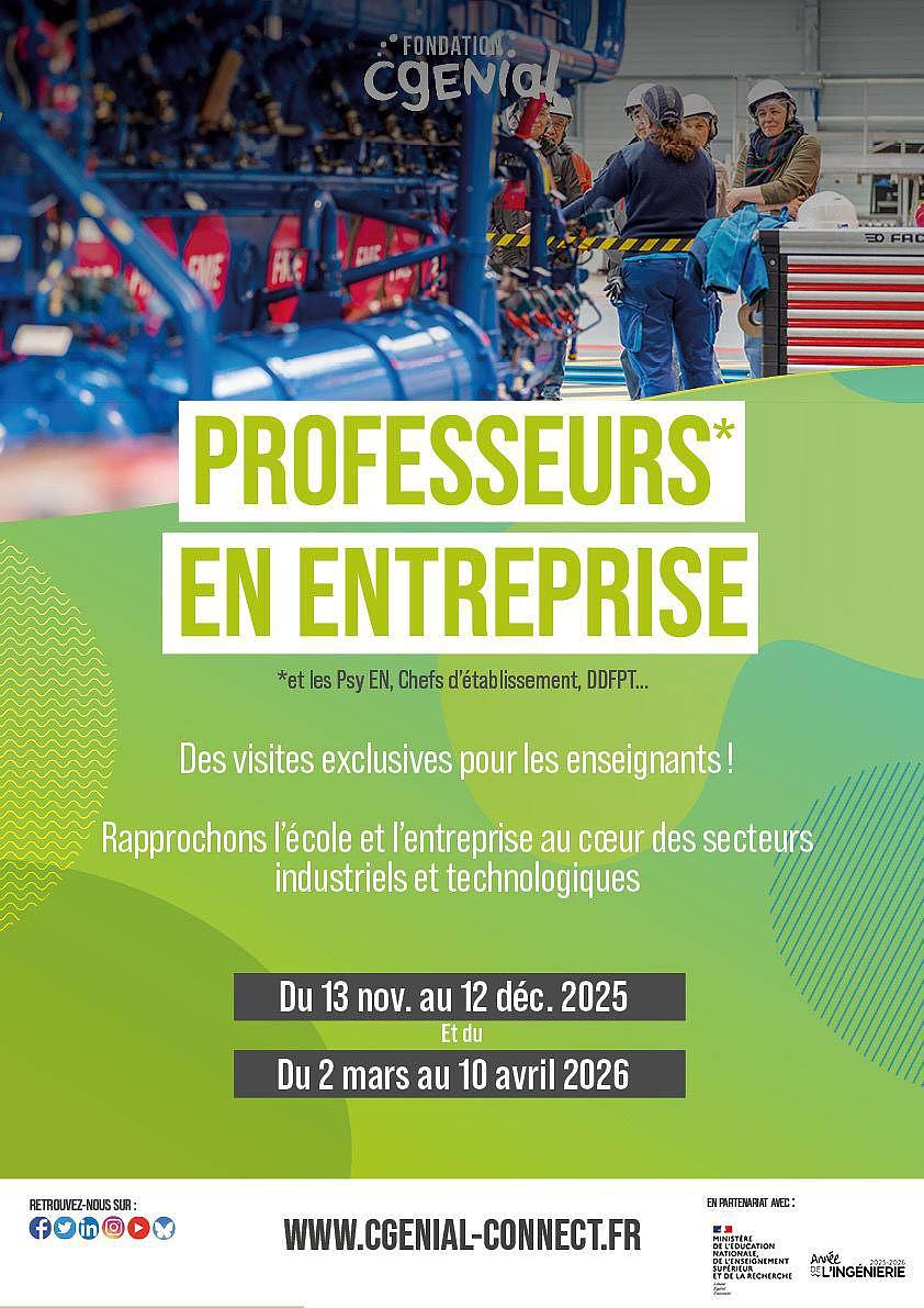 La Fondation CGénial propose aux enseignants (sans les élèves) du secondaire et autres cadres de l’Education nationale de visiter des sites de production, d'innovation ou de recherche et développement sur l’ensemble du territoire national.