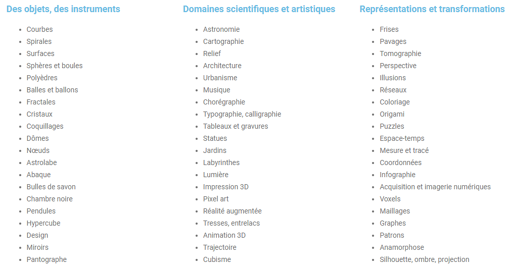 Ce dispositif vise à développer des projets de culture mathématique sur la géométrie, en leur associant un regard artistique et en les liant au monde de la Recherche. Dans le cadre de « Regards de géomètre », chaque classe participante réalisera une production artistique et/ou numérique en lien avec les arts majeurs ou les arts des métiers sous la forme d’une œuvre collaborative qui représente le regard mathématique et artistique des élèves d’un thème choisi parmi 60 proposés.