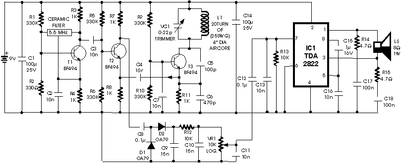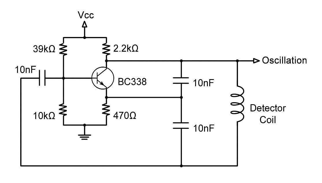 La partie oscillante se situe autour des broches 2 (Trigger), 6 (Threshold) et 7 (Discharge). Les broches 2 et 6 doivent être reliées ensemble. La résistance de 47 kΩ se place entre la broche 7 et le +9 V. C'est ici que le montage devient spécifique à la détection : le réseau composé de la bobine et du condensateur électrolytique se connecte entre la broche 7 et les broches reliées 2/6. Ce circuit LC (Bobine-Condensateur) détermine la période de l'oscillation. La sortie du signal se fait par la broche 3 (Output), qui alimente le haut-parleur, éventuellement à travers un condensateur de liaison pour bloquer la composante continue.