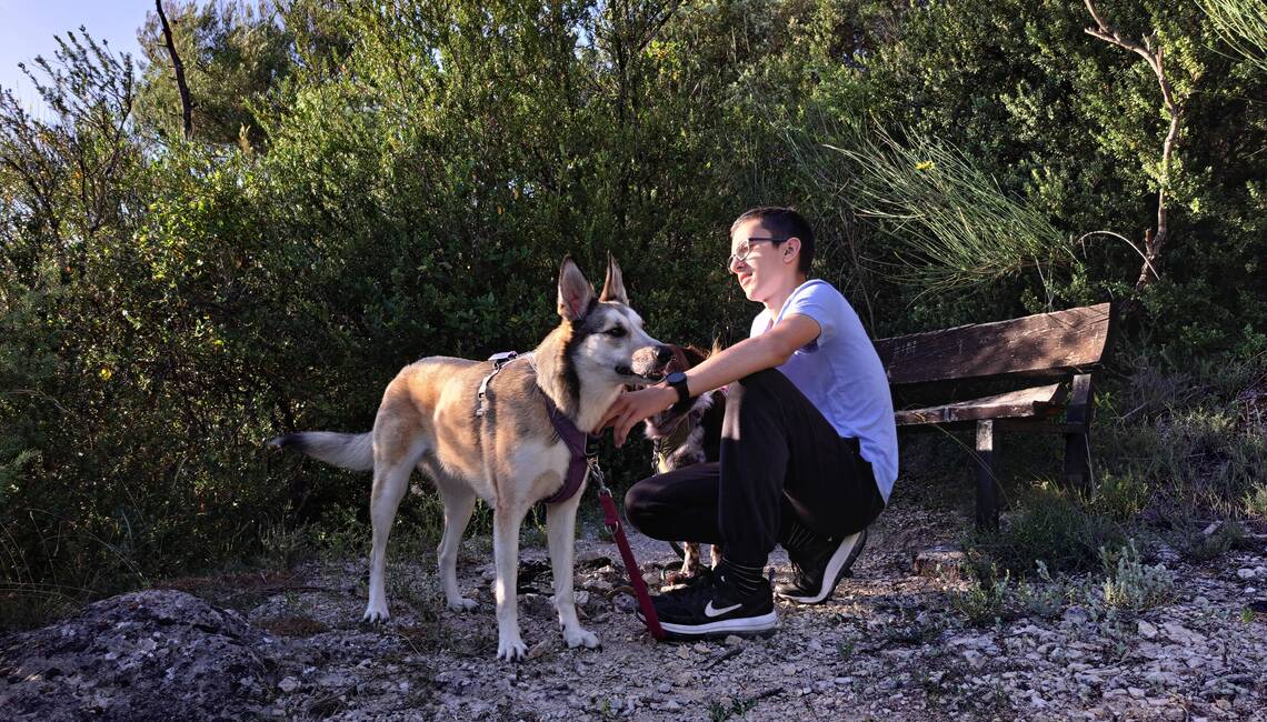 "Depuis ma naissance, il y a toujours eu des chiens à la maison. Aujourd'hui je vis avec mes deux chiens. Il y a Banjo, un croisé Border Collie, qui a 11 ans. Nous l’avons depuis que j’ai 4 ans, alors j'ai l'impression de l'avoir toujours eu. C'est un amour sur pattes ! Il y a aussi Destiny (mais on l'appelle souvent par son petit surnom « Des' »). Elle est croisée de beaucoup de races, entre autres : Chien-Loup Tchécoslovaque, Husky et Malinois.