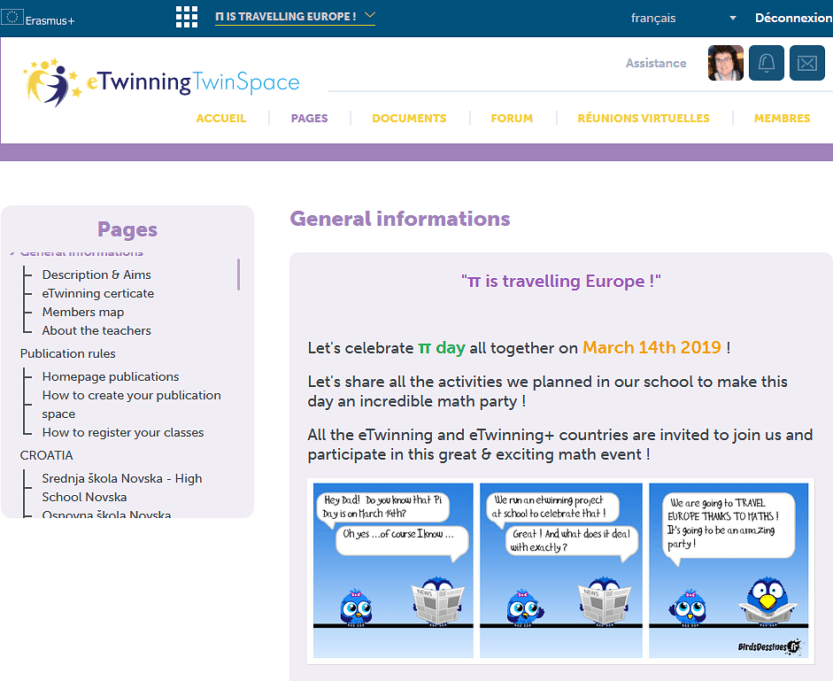 Exemple d'une page d'un twinspace (projet "π is travelling Europe"):