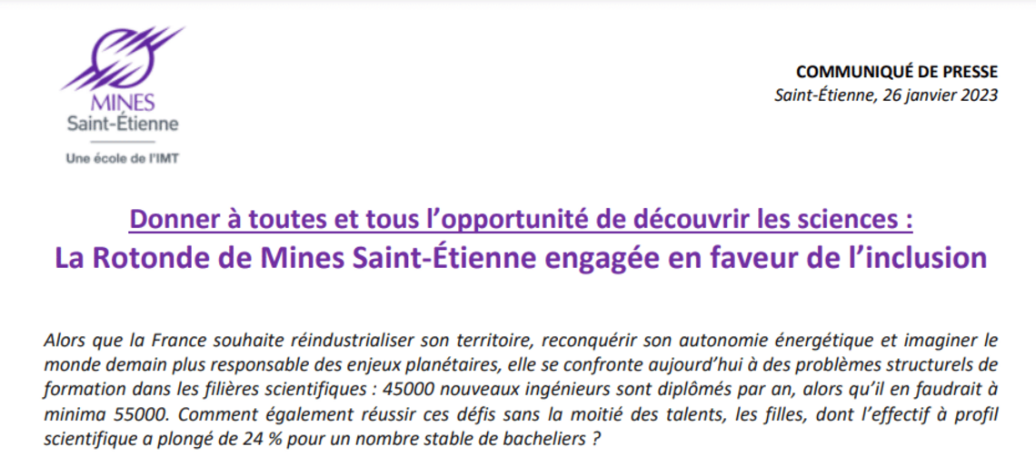 Dans le domaine du développement de l’intérêt des jeunes pour les sciences, l’École des Mines de Saint-Etienne fait figure d’exemple. C’est la seule école d’ingénieur à avoir créé, dès 1999, son propre Centre de Culture Scientifique Technique et Industrielle (CCSTI) : La Rotonde. Il connaît un vif succès (50.000 participants en 2022) et fait figure d’exemple auprès d’autres acteurs de médiation scientifique nationaux qui le sollicitent régulièrement pour imaginer des projets (aussi cité comme exemplaire par Président d'Universcience en déc. 2022).