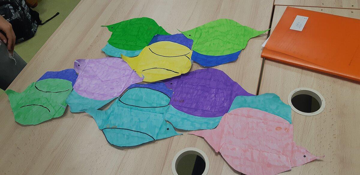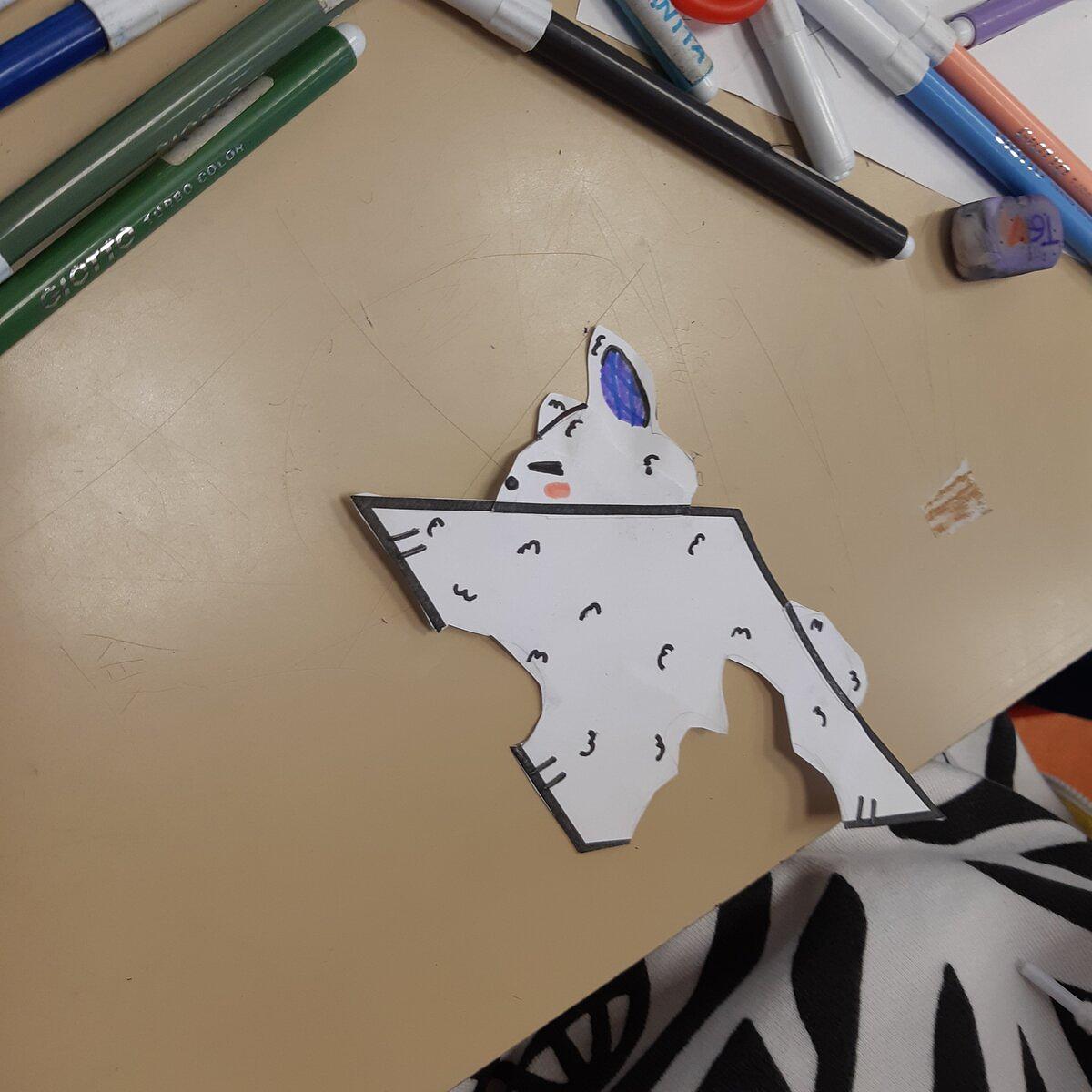 Pour la production finale, Les élèves ont reproduit en grand nombre des mailles en argile issues de la déformation d’un triangle équilatéral. Ensuite, ils ont essayé d’imaginer des formes, voire des scènes qui sont maillées. Le choix s’est porté sur la tortue qui a été complétée par un lapin pour créer une scène de « le lièvre et la tortue ».