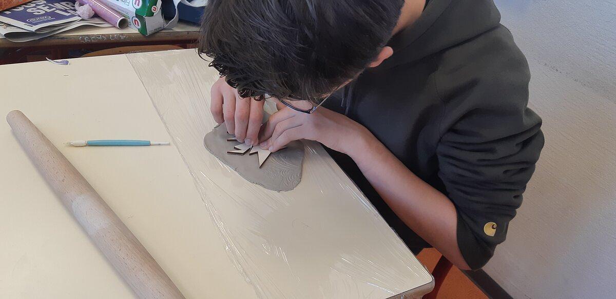 Afin d’avoir un rendu artistique d’un pavage, nous avons fait le choix d’utiliser l’argile et le travailler à l’aide de techniques de poterie. Les élèves ont bénéficié de l’expertise de Magali Cailhol, céramiste. Elle est intervenue auprès des élèves pour leur parler de sa formation, son métier et surtout pour les aider à reproduire les mailles en bois sur des plaques d’argile.
