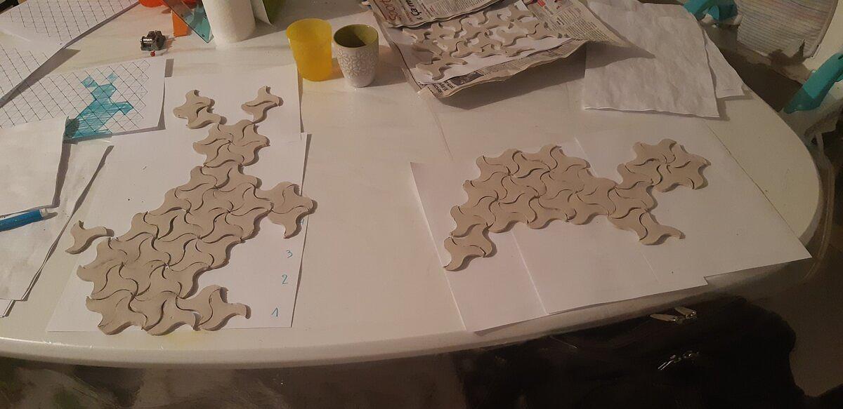 La céramiste a accompagné les élèves dans les différentes parties : elle a fourni l’argile utilisé lors de cette séance et elle a guidé pour qu’ils puissent réaliser des plaques d’argile d’épaisseur uniforme. Puis, grâce à différents outils et techniques, elle a aidé les élèves à découper et extraire les mailles d’argile à partir des formes découpées dans le bois en produisant le moins de déformation possible. Elle a rassemblé les différentes pièces pour les cuire dans son atelier, chaque élève a pu voir ses mailles produites en céramique de qualité professionnelle.