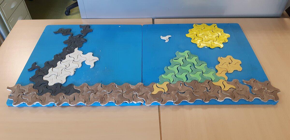 L'assemblage des pièces s'est fait sur une plaque de bois pour permettre l'exposition de l'œuvre. Ils étaient fiers de leur production qui a été présentées à l'ensemble des élèves au CDI du collège à l'occasion de la semaine des mathématiques.