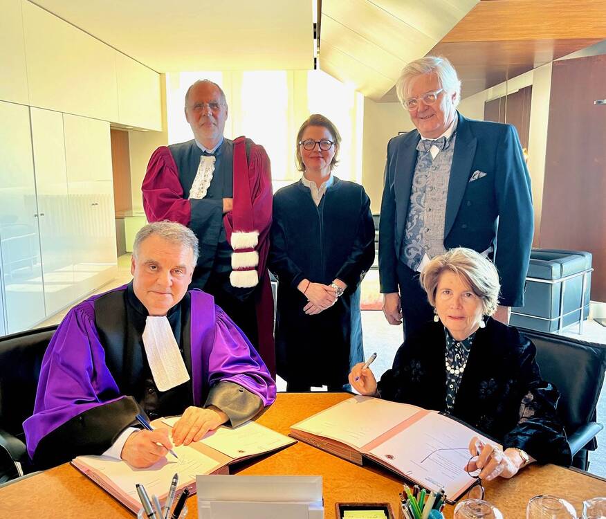 Le président d’Aix-Marseille Université, Éric Berton, et la présidente de l’Académie des Sciences, Lettres & Arts de Marseille, Marina Lafon-Borelli ont signé une convention de partenariat, en présence du secrétaire perpétuel de la classe des sciences, Marc Sentis, de la secrétaire perpétuelle des Lettres & Arts, Catherine Dureuil, et du vice-président chancelier, Gérard Detaille.