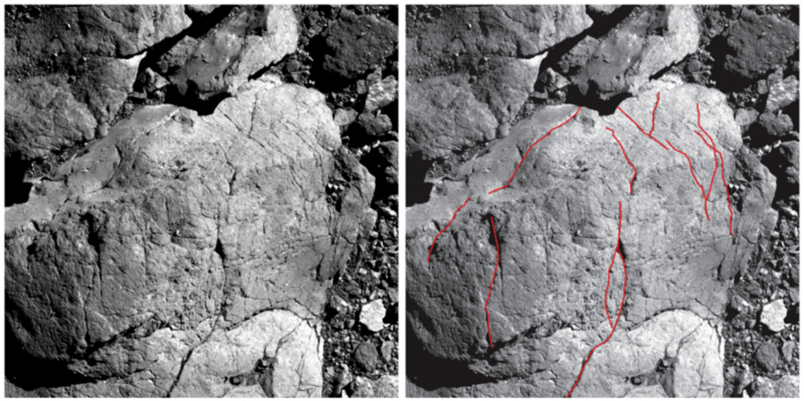 Plus de 1500 fractures sur les blocs rocheux à la surface de Bénou ont ainsi été analysées et combinées à une modélisation thermo-mécanique. Les résultats montrent une fracturation caractéristique d’un processus de choc thermique lié aux différences de température importantes entre le jour (très chaud : ≈ 80 C) et la nuit (très froide : ≈ - 80 C) présentes sur l’astéroïde.
