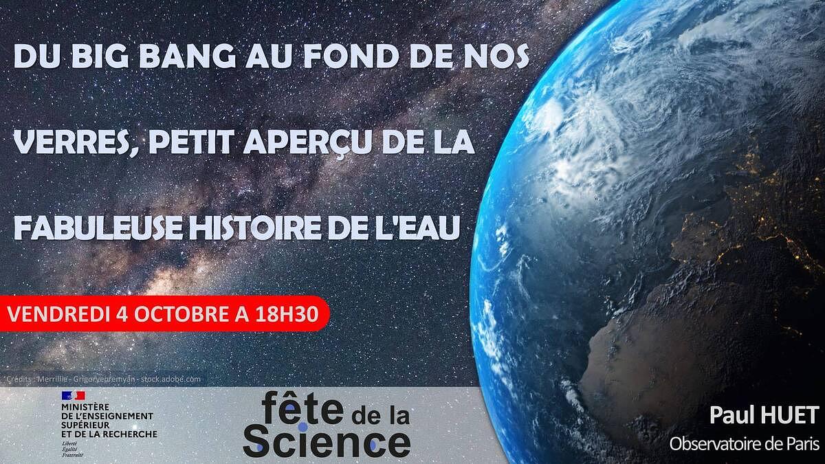 Omniprésente dans nos vies et indispensable à la vie, l'eau qui nous entoure a subi une histoire mouvementée. Au cours de cette conférence, nous tenterons de retracer ce périple depuis les origines mêmes de l'univers. Elle est en effet intimement liée à la formation des planètes et des étoiles, et elle est encore aujourd'hui incomplète. Nous discuterons des progrès récents de la recherche sur ce sujet, des simulations aux observations par les instruments les plus précis de l'histoire.