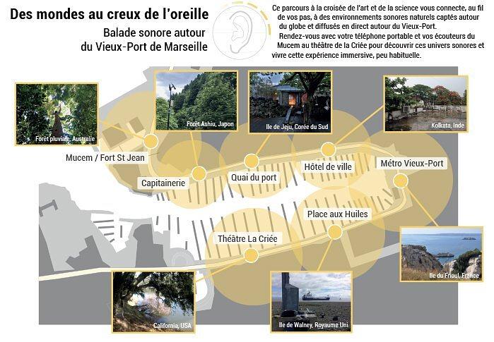 Fruit de la rencontre entre artistes et scientifiques, Des mondes au creux de l’oreille est une installation proposant une balade dans des paysages sonores captés en sept points du globe. En se connectant simplement à la web app, le public est invité à déambuler le long du Vieux-Port de Marseille et à se laisser porter à l’écoute d’environnements sonores naturels, proches ou lointains, connus ou inconnus, qui lui parviennent au creux de l’oreille… www.desmondesaucreuxdeloreille.net