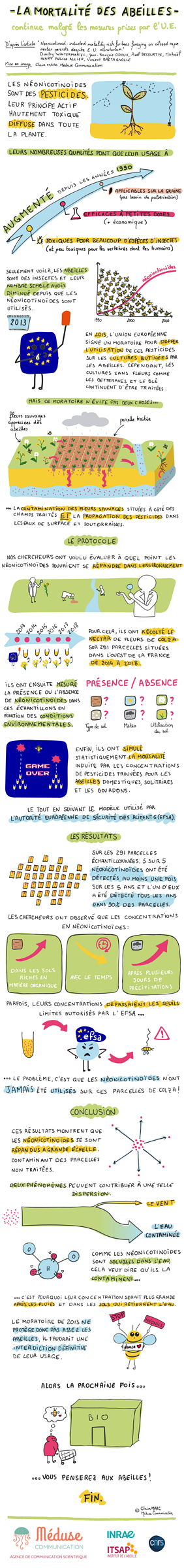 Cette BD est tirée de l’article « Neonicotinoid-induced mortality risk for bees foraging on oilseed rape nectar persists despite EU moratoritum ». Merci à ses auteurs du CNRS, de l’INRAE et de l’ITSAP.