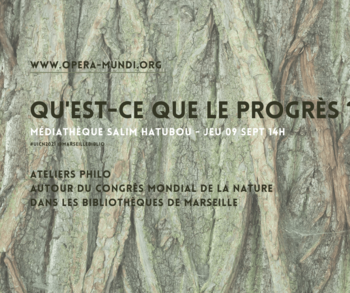 18 ateliers de discussion et de pratique philosophiques ouverts à tous portés dans les Bibliothèques de Marseille ouvrent des pistes de réflexion autour des fondements des relations que nous entretenons avec la nature, le vivant, le soin, le progrès...