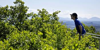 Photo : Chercheur travaillant sur la plateforme expérimentale de l'O3HP, installée depuis 2009 sur le site de l'Observatoire de Haute-Provence (OHP). Ce dispositif est composé de passerelles instrumentées permettant d'accéder à plusieurs strates de la forêt. @THIBAUT VERGOZ - IMBE / CNRS PHOTOTHÈQUE