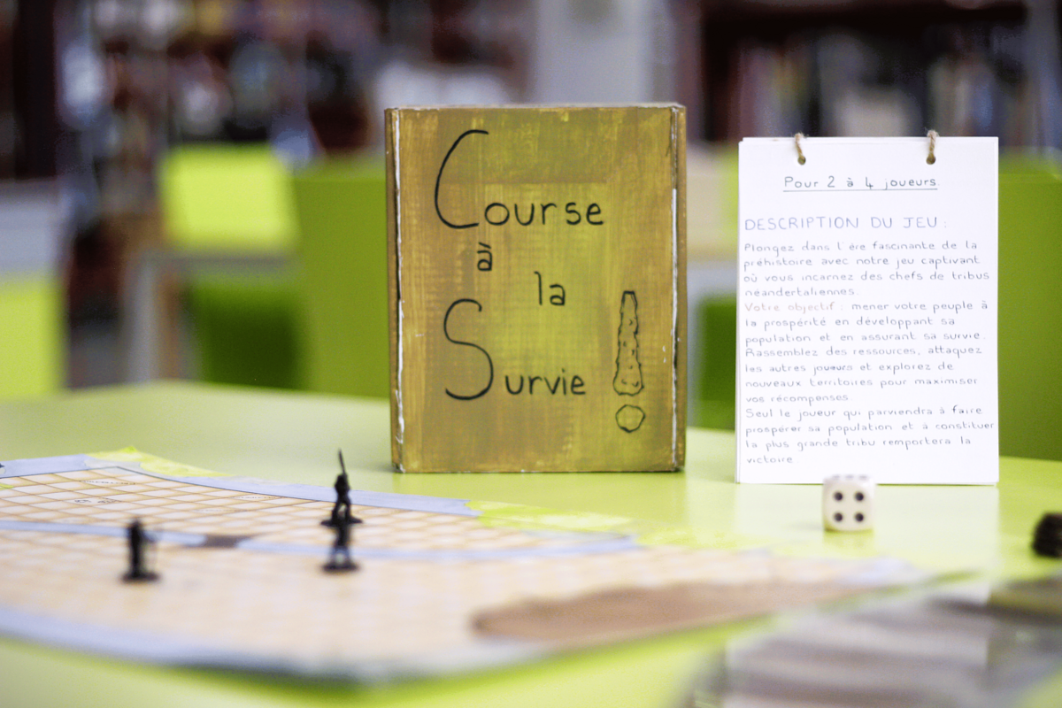 En équipe, Lison, Marig et Christopher on créé le jeu "Course à la survie". Marig raconte : « Pour créer notre jeu, nous nous sommes inspirés du Cluedo et des Mille Bornes. J'ai adoré concevoir le plateau et le design. Ce qui m’a le plus étonnée, c’est à quelle vitesse nos idées ont fusé ! Le plus difficile a été de rendre nos idées réalisables. J'ai appris qu’il reste encore beaucoup de questions sans réponse sur l’évolution humaine. » Christopher ajoute : « J'ai aimé colorier les cartes, c'était relaxant. La création de règles claires a été un vrai défi. »