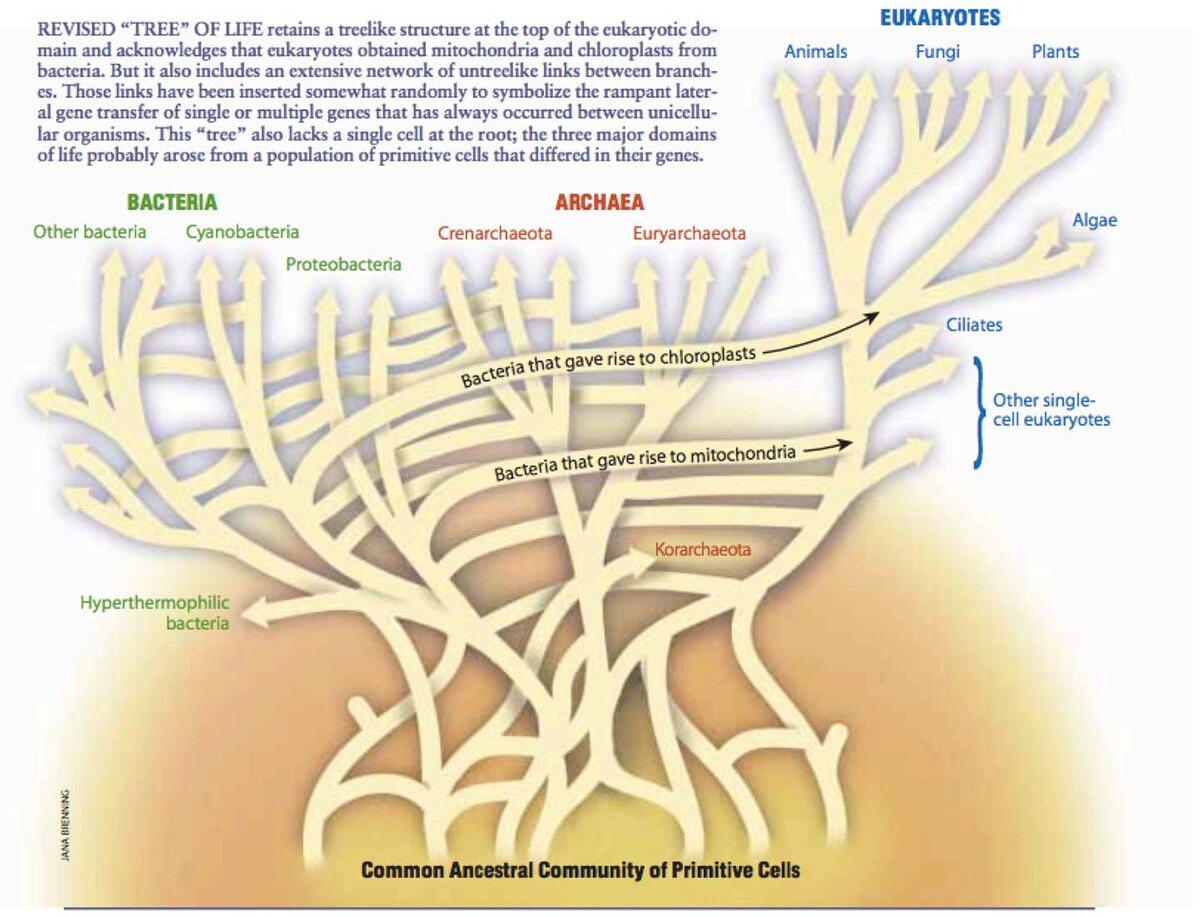 C'est désormais un réseau qui représente l'origine du vivant. De la rencontre "durable" de microbes, issus des archées et des bactéries, émerge une troisième voie, celle des eucaryotes.
