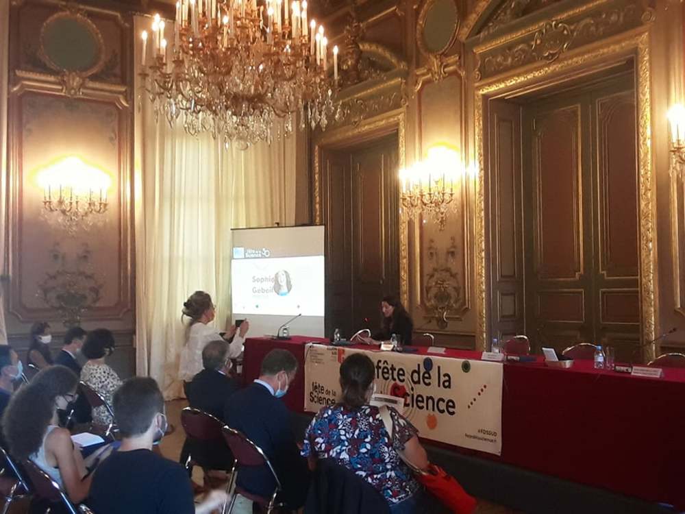 Photo : Prise de parole de Sophie Gebeil, ambassadrice régionale de la Fête de la Science, lors de la journée de lancement de la Fête de la Science le 21 sept. 2021