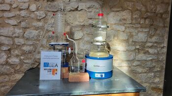 L’alambic en verre est un support pédagogique qui permet de décrire et d’observer la distillation. En visualisant les flux, les élèves comprendront le principe de la distillation :la vapeur d’eau traverse le végétal et entraîne les molécules d’huiles essentielles. Il observeront le changement de phase et la séparation des constituants en fonction de leur densité, avec d’un côté l’huile essentielle et de l’autre l’eau florale.