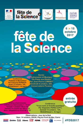 Une soirée astro-musicale avec Jean-Pierre LUMINET (LAM) pour ouvrir le 6 octobre au Conservatoire PICASSO, de l'histoire des sciences avec l'aventure de Pythéas le Marseillais par François HERBAUX (auteur des Nuits blanches de Pythéas le Marseillais) le 12 puis pour finir en beauté Alejandro PEREZ (CPT) viendra nous parler trou noir et gravité quantique le 14. (Synopsis sur notre site web)
