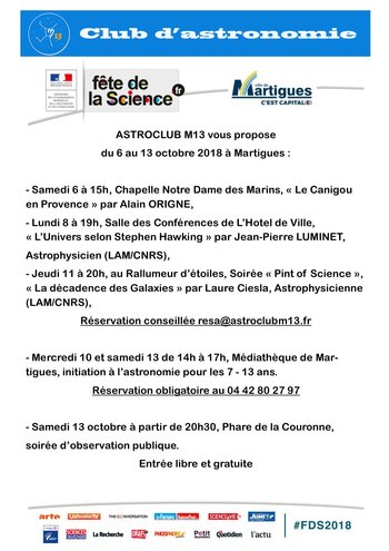 Le club d'astronomie M13 vous propose un vaste programme à l'occasion de la Fête de la Science 2018. A travers toute la ville, de la Chapelle Notre Dame des Marins au canal de Caronte puis en bord de mer, vous trouverez forcément votre bonheur.