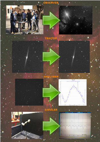 Les images de la galaxie sont traitées (soustraction des offset, dark et division par les flats) pour obtenir, après alignement et superposition, une image finale. La courbe de rotation d’un aste roïde est obtenue, après traitement des images brutes, par photome trie diffe rentielle, toujours avec AstroImageJ.