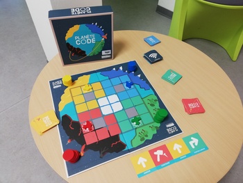 Planète Code est un jeu de plateau collaboratif et coopératif qui propose un apprentissage débranché et progressif du code et de la programmation. Il propose trois niveaux de difficultés.