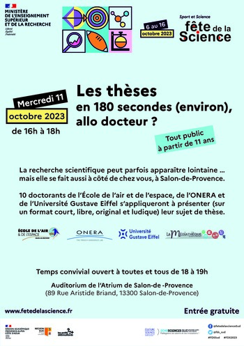 La recherche scientifique peut parfois apparaître lointaine … mais elle se fait aussi à côté de chez vous, à Salon-de-Provence. 10 doctorants de l’École de l’air et de l’espace, de l’ONERA et de l’Université Gustave Eiffel s’appliqueront à présenter (sur un format court, libre, original et ludique) leur sujet de thèse.