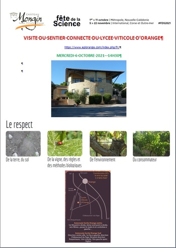 Sous la conduite d'une enseignante animatrice des éco-ambassadeurs, le nouveau sentier connecté du Lycée Viticole d'Orange vous sera présenté selon les axes suivants : biodiversité dans les vignes, suivi vers de terre/abeilles/papillons, qualité de l'air, haie diversifiée, jardin pédagogique agroécologique et autres.