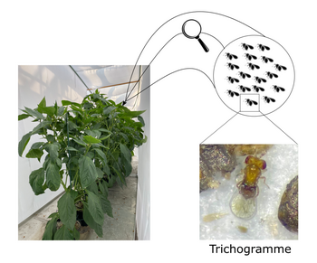 Au niveau mondial, 24 % des émissions de Gaz à effet de serre sont liés aux activités humaines d’origine agricole. Ces émissions ont différentes origines : les animaux d’élevage, l’utilisation d’engrais, et l’utilisation de pesticides et de tracteurs servant à les épandre. Pour limiter les émissions dues à cette dernière activité, il est possible de remplacer les pesticides par l’utilisation d’organismes vivants pour lutter contre les ravageurs, c’est ce que l’on appelle la lutte biologique. Aujourd’hui, l’un des meilleurs organismes, largement utilisés dans le monde et sur lequel l’INRAE travaille, s’appelle Trichogramme. Les trichogrammes sont de minuscules guêpes (moins d’1 mm) dites parasitoïdes oophages, c’est-à-dire que les femelles pondent leurs œufs dans ceux des ravageurs. Afin d’assurer leur efficacité au champs, il est nécessaire de développer des critères de sélection appropriés comme la fécondité, la longévité ou encore la façon dont les femelles se dispersent !