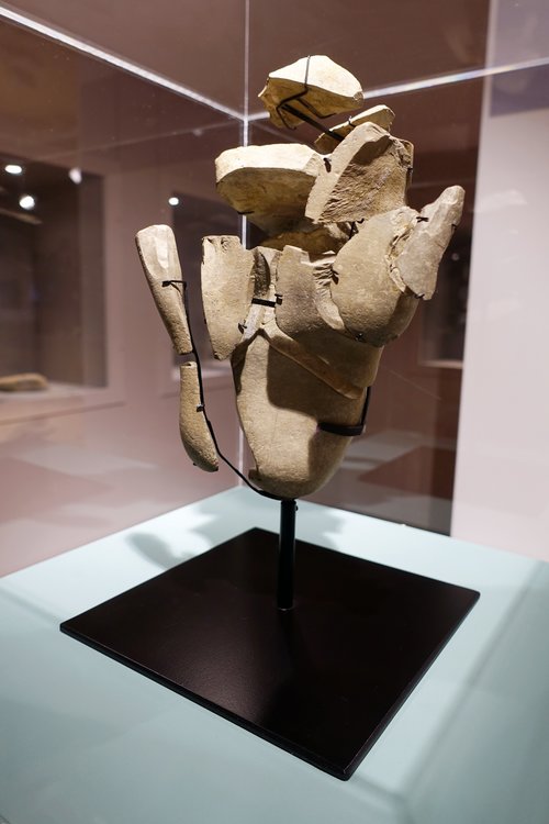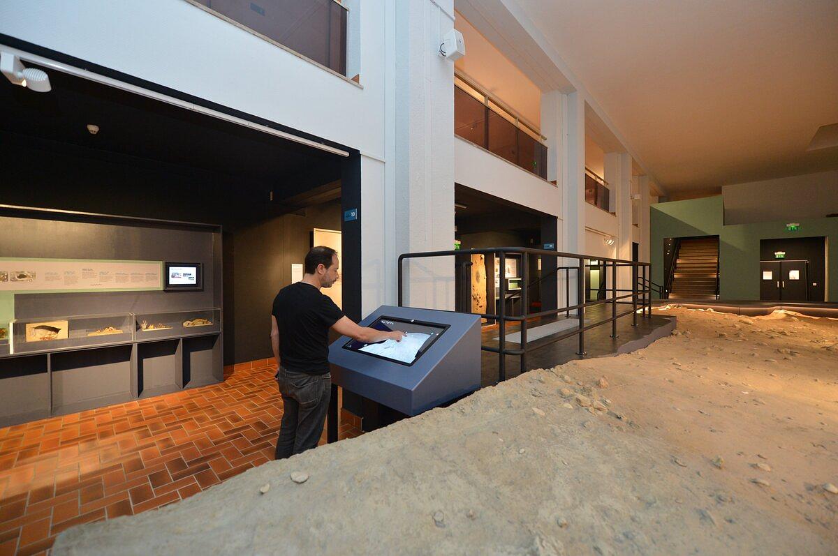 Le grand moulage du sol archéologique DM (UA DA4), qui permet de découvrir l’un des vingt-six niveaux archéologiques du site sur plus de 70 m2, fait partie de l’identité du musée. Il en constitue même, en quelque sorte, son ADN. Il n’était pas question de le transformer ou de le supprimer bien que sa présence marque profondément l’identité visuelle du lieu. Ainsi, tout autour de lui, l’ensemble des autres éléments scénographiques ont été modifiés, sur les deux niveaux, afin de créer de nouveaux espaces. Cette nouvelle présentation originale a été confiée à Kristof Everart pour la scénographie et à Marcel Bataillard pour l’identité graphique. Il s’agissait de développer une proposition visuelle à la fois élégante et résolument contemporaine, tout en conservant une approche scientifique et ludique. Les deux niveaux du musée ont pu bénéficier des ces améliorations qui ont permis une modernisation des espaces mais également de la présentation des collections. Ainsi, les objets ont pu être soclés par l’atelier François Ourth. De plus, les vitrines ont été entièrement repensées afin d’améliorer la lisibilité de la présentation des collections. Par ailleurs, une baie vitrée permet maintenant aux visiteurs de découvrir les magnifiques réserves du musée pour constituer un trait d’union entre la présentation des collections au public et leur conservation mais également le monde de la recherche.