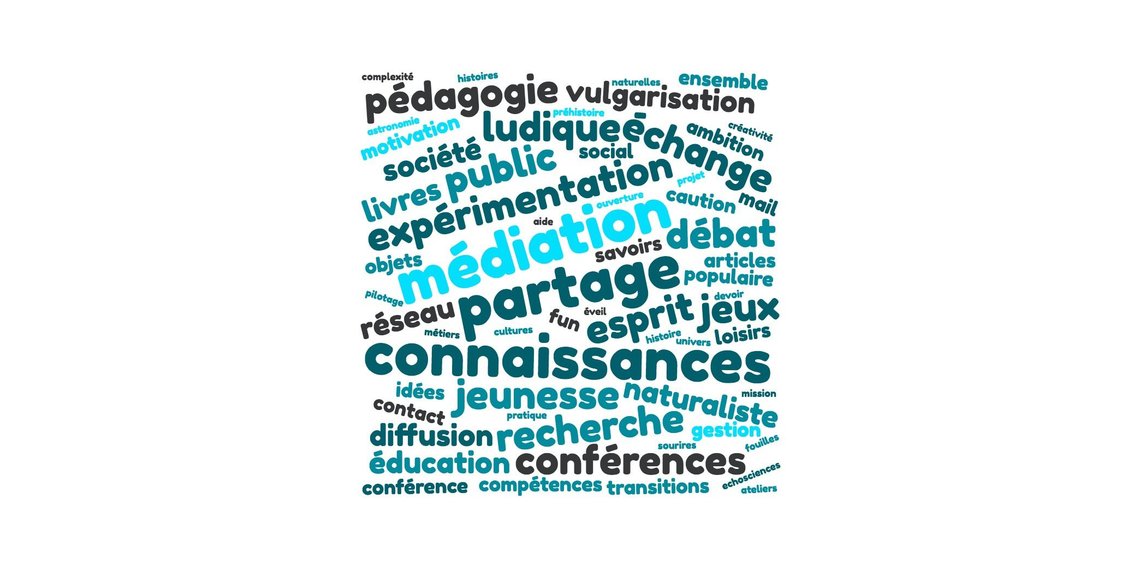 Ci-dessus le nuage de mots réalisé grâce à vos réponses : Quels sont les 5 mots qui caractérisent au mieux vos actions de culture scientifique ?