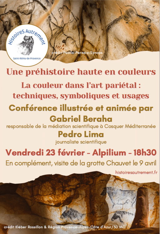 L'association Histoire Autrement propose une conférence sur l'art pariétal et les couleurs de la préhistoire, le vendredi 23 février à 18 H 30 à l'Alpilium de Saint-Rémy-de-Provence, animée par Gabriel Beraha (Cosquer Méditerranée) et Pedro Lima (auteur et journaliste scientifique).
