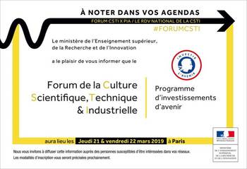 Le ministère de l'Enseignement supérieur, de la Recherche et de l'Innovation organise un Forum national de la Culture Scientifique, Technique et Industrielle autour notamment du Programme d'investissements d'avenir, les jeudi 21 & vendredi 22 mars 2019 à Paris.