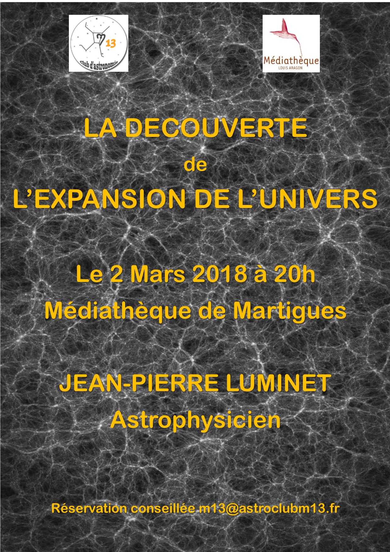Jean-Pierre LUMINET, astrophysicien, directeur de recherche CNRS au LAM et parrain de notre association sera présent vendredi 2 mars 2018 à 20h à la médiathèque de Martigues pour nous présenter une conférence intitulée "La découverte de l'expansion cosmique".