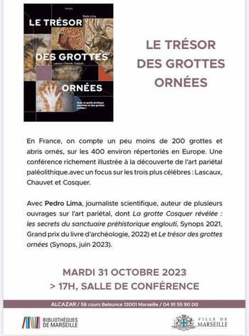 Rdv le mardi 31 octobre 17h à l’Alcazar de Marseille (bibliothèque municipale à vocation régionale) avec Pedro Lima pour une conférence de partage des connaissances sur l’art pariétal paléolithique et les grottes ornées. Conditions précises des découvertes, richesse et beauté des oeuvres peintes et gravées, implications sur notre compréhension des sociétés paléolithiques... Le conférencier partage les savoirs et les émotions. Venez nombreuses et nombreux, entrée libre et gratuite.