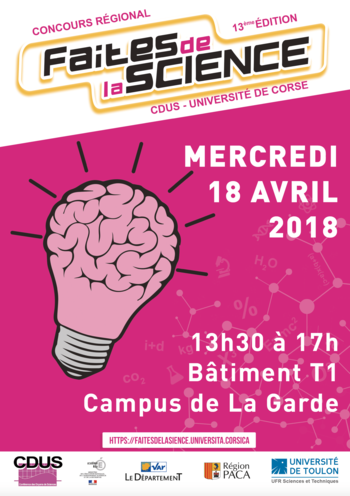 L’UFR Sciences et Techniques accueillera des jeunes des collèges Pierre de Coubertin (Le Luc), Louis Clément (Saint–Mandrier-sur-Mer), Les Chênes (Fréjus), Frédéric Mistral (Bormes Les Mimosas) et des lycées Raynouard (Brignoles), Beaussier (La Seyne sur Mer), Parc St-Jean (Toulon) et Maintenon (Hyères) dans le cadre de la phase locale du concours « Faites de la science ».