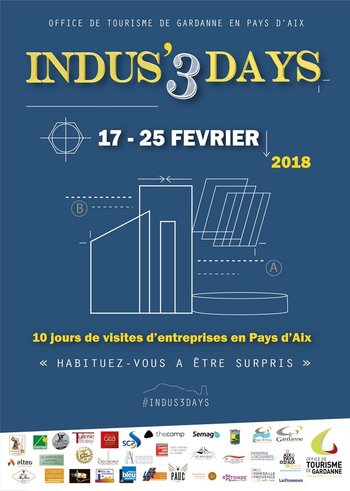 Pour la troisième édition des Indus'3Days, l'équipe de l'Office de Tourisme de Gardanne (animateur de la filière "Tourisme industriel et scientifique" en Pays d'Aix) vous propose des visites inédites, dans des domaines variés : industries, environnement, culture et patrimoine, terroir et gastronomie, histoire, artisanat, ... sur l'ensemble du Pays d'Aix.