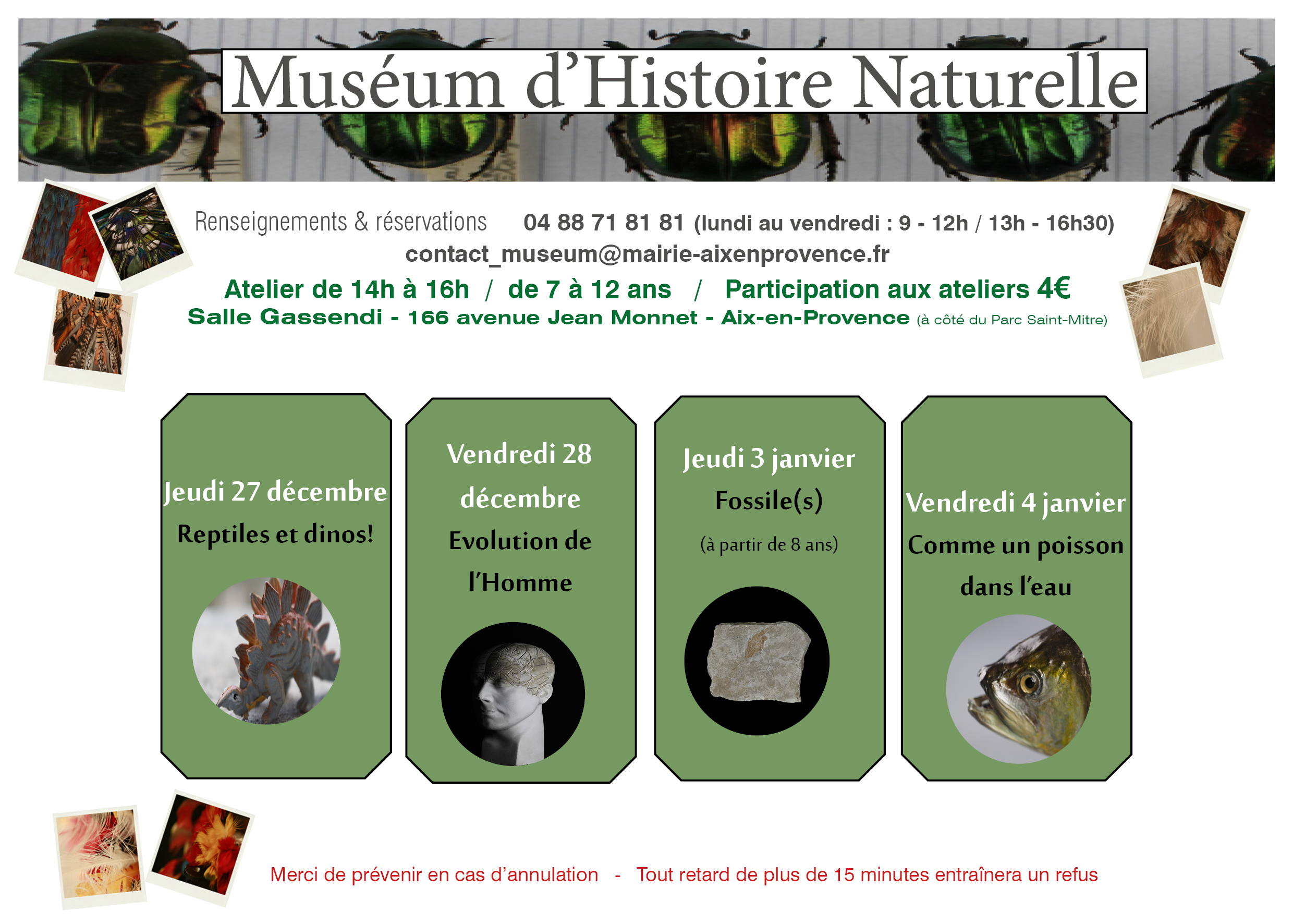 Le Muséum d'Histoire Naturelle d'Aix-en-Provence vous propose des ateliers pour les enfants de 7 (CP ou CE1 en fonction des ateliers) à 12 ans.