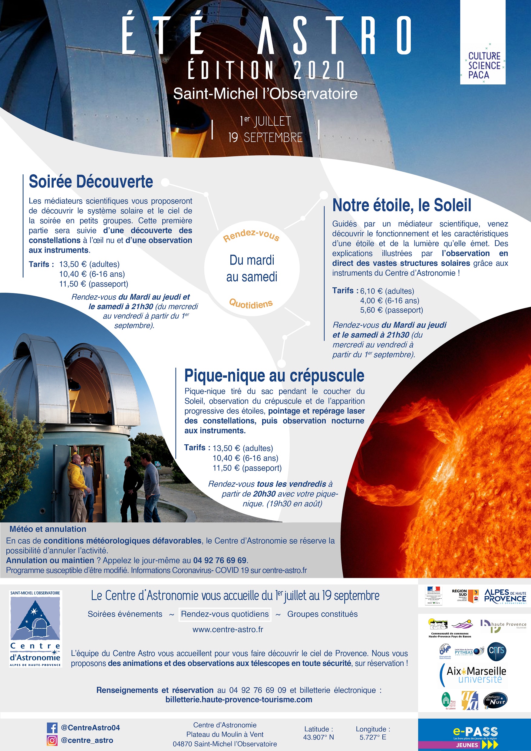 Allongés dans l’herbe, vous assistez à un repérage laser des constellations, véritable randonnée céleste dans le ciel de Haute-Provence. Vous serez en effet surplombés par le Triangle d’Été, tandis qu’au Sud, le Scorpion darde la Voie lactée de sa queue empoisonnée. Animation par David Calmels et Sébastien Desloires, médiateurs au Centre d’Astronomie.