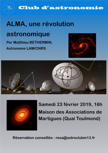Matthieu Béthermin, Astronome au Laboratoire d'Astrophysique de Marseille vient nous parler d'ALMA (pour Atacama Large Millimeter Array), l'un des télescopes les plus ambitieux jamais construits. Son but était d'ouvrir une nouvelle fenêtre sur l'Univers froid (nuages de gaz galactiques, disques protoplanétaires, gaz des premières galaxies...). Cet interféromètre micro-ondes se compose de 64 antennes de 12 m et 12 antennes de 7 m est construit sur l'altiplano andin à 5000 mètres d'altitude pour un coût dépassant le milliard d'euros. Ceci semble être un effort démesuré, mais les résultats spectaculaires sont bien à la mesure des attentes. Il présentera les défis techniques (et humains!) relevés lors de la construction et de la mise en place d'ALMA, puis il résumera les résultats les plus spectaculaires obtenus (systèmes planétaires en formation, lentilles gravitationnelles...).