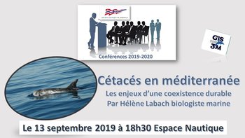 Le 13 septembre 2019 à 18h30 aura lieu la conférence « Cétacés en Méditerranée, les enjeux d’une coexistence durable », présentée par Hélène Labach, biologiste marine, chargée de projet au Groupement d’Intérêt Scientifique pour les Mammifères Marins en Méditerranée (GIS3M).