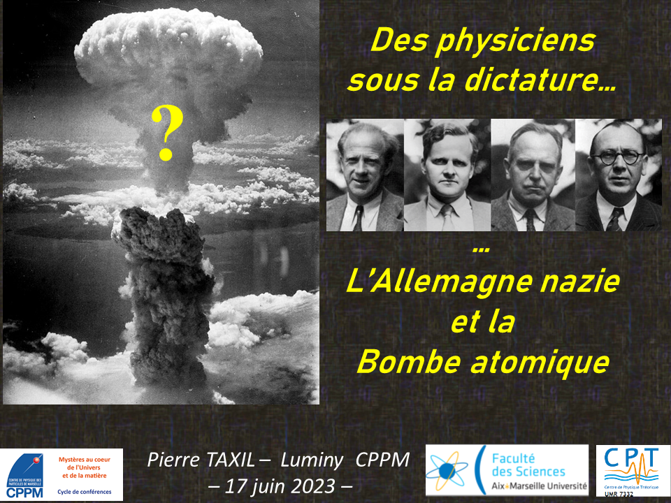 La prochaine conférence grand public du CPPM aura le 17 juin à 10 heures et portera sur ""Des physiciens sous la dictature : l'Allemagne nazie et la bombe atomique" par Pierre Taxil, professeur émérite AMU (CPT, CNRS/AMU/UTLN).