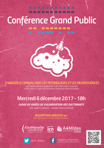 Les étudiants du PhD Program de Neurosciences Intégratives et Cliniques (http://neuro-marseille.org/fr/...) organisent une conférence grand public pour mieux faire connaître les neurosciences au plus grand nombre. Dans le cadre de l'édition 2017 des PhD Days (phddays2017.sciencesco...), le professeur Didier Courbet (Aix-Marseille Université) nous fera découvrir comment "Changer le cerveau avec les technologies et les neurosciences" par l'exemple du gaming et du neuromarketing. Il expliquera quels sont les effets des jeux vidéos numériques, notamment les "serious game", sur les individus, leurs cognition, leurs émotions et leur comportement. Il adoptera pour cela la perspective des neurosciences, de la psychologie cognitive et de la psychologie sociale. Cette conférence est ouverte à tous et met notamment en valeur les recherches réalisées à Aix-Marseille Université.