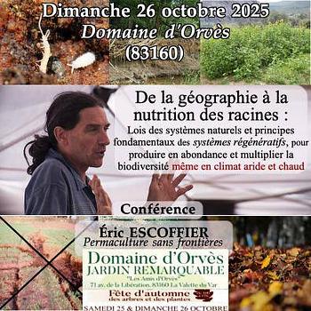 Conférence par Éric Escoffier, suivie d'une session de questions-réponses/discussiondans le cadre de la Fête d'automne des arbres et des plantes organisée par le Domaine d'Orvès.
