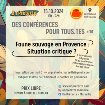 Cette conférence, inscrite dans la série "Des Conférences pour Tous.tes", réunira 5 experts autour d’un thème commun : la faune sauvage en Provence. Vous serez sensibilisés aux enjeux de sa conservation et peut-être même inspirés à vous impliquer pour protéger cette précieuse biodiversité. Chaque intervention, limitée à 15 minutes, sera suivie d’un temps d’échange pour permettre aux participants d'approfondir les sujets qui les interpellent.