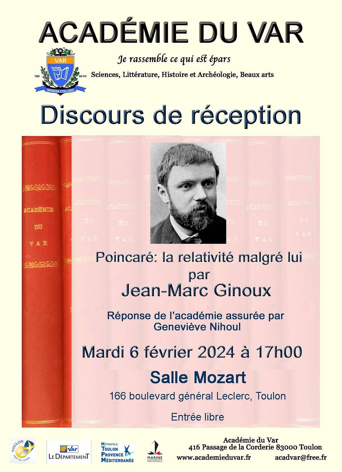 Après avoir prononcé l'éloge de M. Robert Giannoni, je présenterai une conférence d'une heure intitulée Poincaré : la Relativité malgré lui .