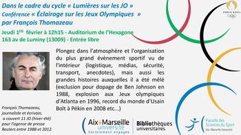 Cadre: cycle "Lumières sur les JO" organisé par la bibliothèque universitaire de Luminy et la Faculté des sciences du sport (FSS) : 4 conférences et une exposition entre février et avril 2024